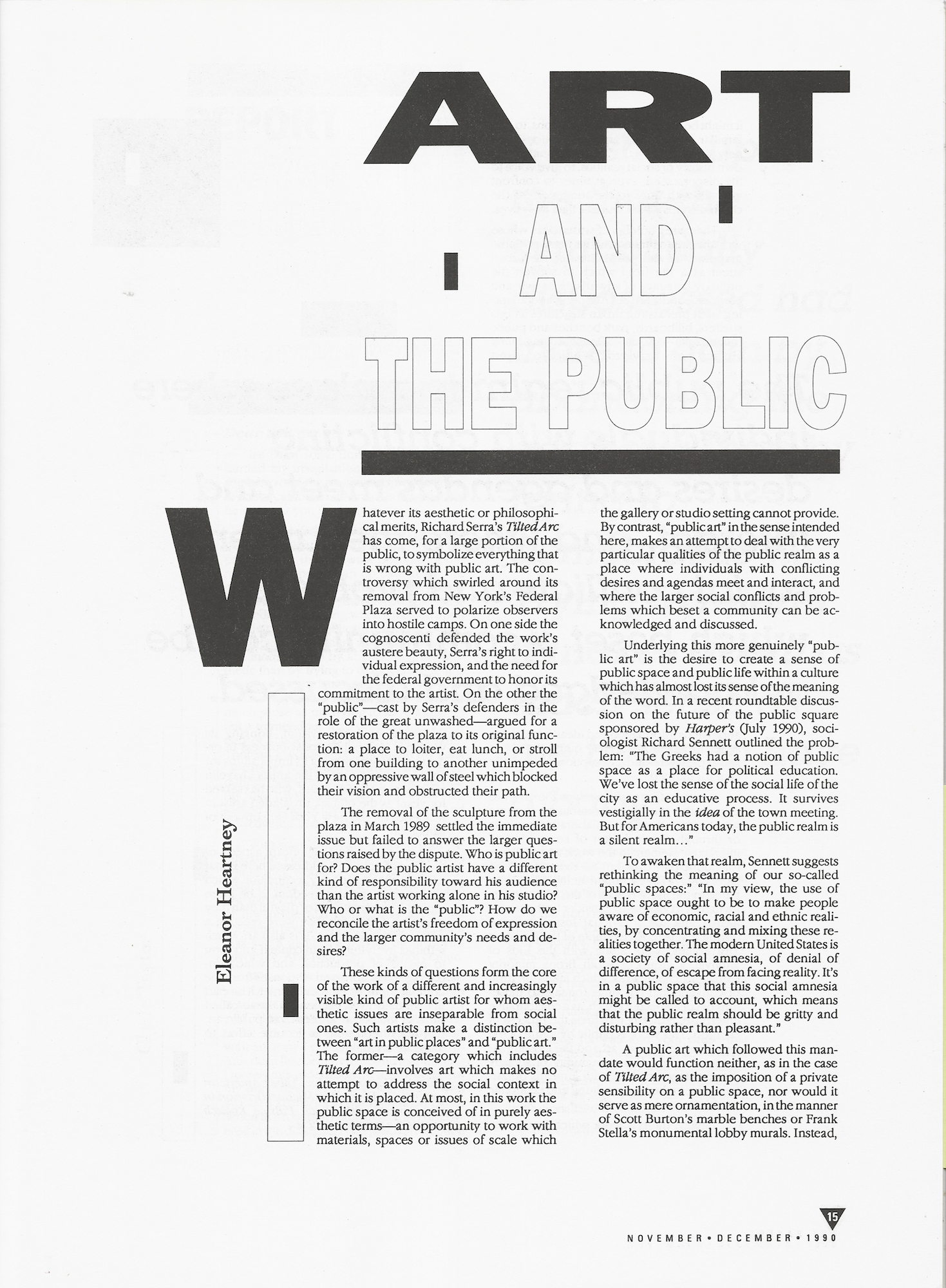 Underlying this more genuinely “public art” is the desire to create a sense of public space and public life within a culture which has almost lost its sense of the meaning of the word. In a recent roundtable discussion on the future of the public square sponsored by Harper’s (July 1990), sociologist Richard Sennett outlined the problem: “The Greeks had a notion of public space as a place for political education. We’ve lost the sense of the social life of the city as an educative process. It survives vestigially in the idea of the town meeting. But for Americans today, the public realm is a silent realm…”