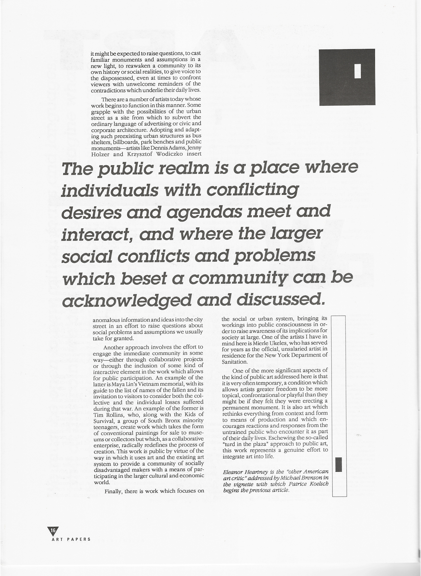 These kinds of questions form the core of the work of a different and increasingly visible kind of public artist for whom aesthetic issues are inseparable from social ones. Such artists make a distinction between “art in public places” and “public art.” The former—a category which includes Tilted Arc—involves art which makes no attempt to address the social context in which it is placed. At most, in this work the public space is conceived of in purely aesthetic terms—an opportunity to work with materials, spaces or issues of scale which the gallery or studio setting cannot provide. By contrast, “public art” in the sense intended here, makes an attempt to deal with the very particular qualities of the public realm as a place where individuals with conflicting desires and agendas meet and interact, and where the larger social conflicts and problems which beset a community can be acknowledged and discussed.