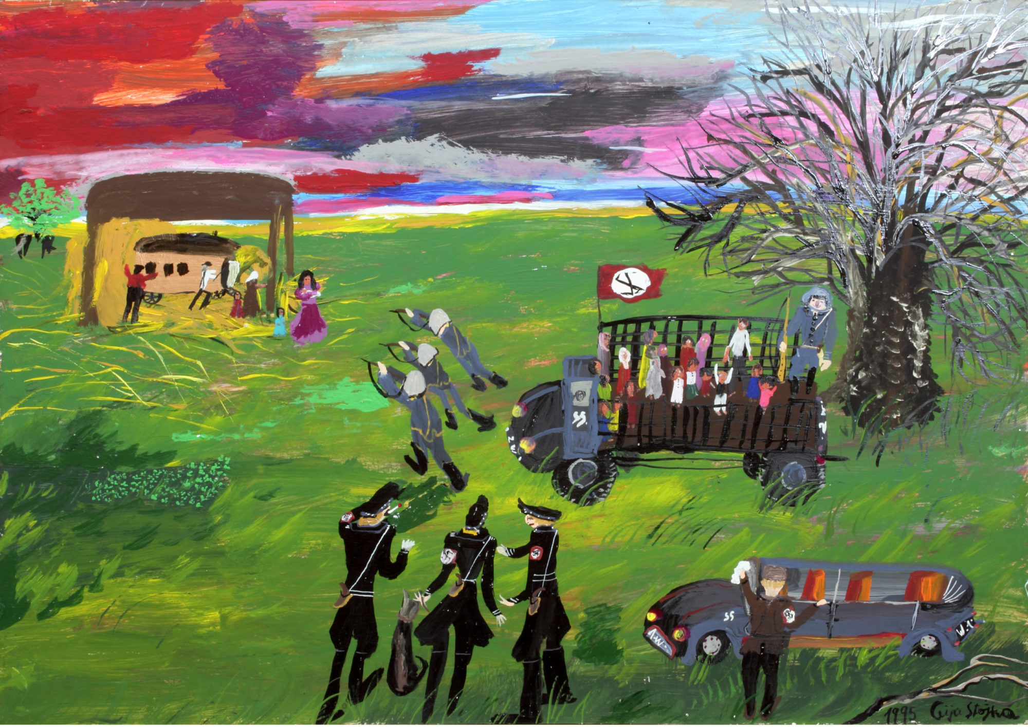 Stojka was born on May 23, 1933, in Kraubath, Austria, to a family of nomadic Romani horse traders. Her paintings show an idyllic childhood filled with close-knit family members, cozy caravans, and blooming landscapes. But the rainbow colors of Stojka’s youth give way to bleaker hues when she depicts the first phase of her trauma: Nazis rounding up Romani and Sinti people throughout the Austrian countryside. In Gefangennahme und Abtransport (Arrest and Deportation) (1995), armed SS forces exit their deportation truck full of prisoners and approach a shrunken family huddled together in fear. As with many of Stojka’s pictures, nature communicates the mood: a jagged, ashen cloud splits the sky, and a barren, desiccated tree foreshadows the calamity to come.