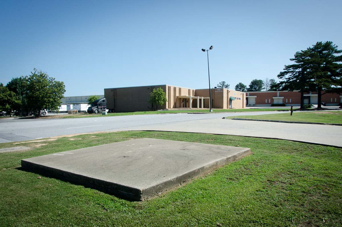 The site is now solely and unmistakably an industrial park; its atmosphere is precisely as Dehner described it wouldn’t be. Trucks zoom along wide, empty roads to the Publix supermarket and FedEx depots there. Many of the buildings are boarded up amid mostly empty parking lots. The layers of the years are apparent: outlines of signage for companies once headquartered in the park are still traced on some of its nondescript façades, and train tracks overgrown with vegetation remain visible in parts of the site. Before the area was leveled to build the park, it had been part of Sandtown, an early settlement for the mix of Native Americans that the English called Creek Indians, and later a plantation; what is now called the Rev. Bill Allison Memorial Cemetery, a potter’s field filled with unmarked graves, still sits on a hill next to the site. On the park’s curbsides and medians, service access points and storm drains dot the struggling grass, punctuated by an occasional empty concrete plinth. At the top of one T-junction is a small alcove where two twisted, rusting poles jut from a rectangular base. Elsewhere, a broad, low decommissioned plinth has been painted bright blue, with “650” stenciled in white on its side to mark the street number of the distribution warehouse that sits behind it.