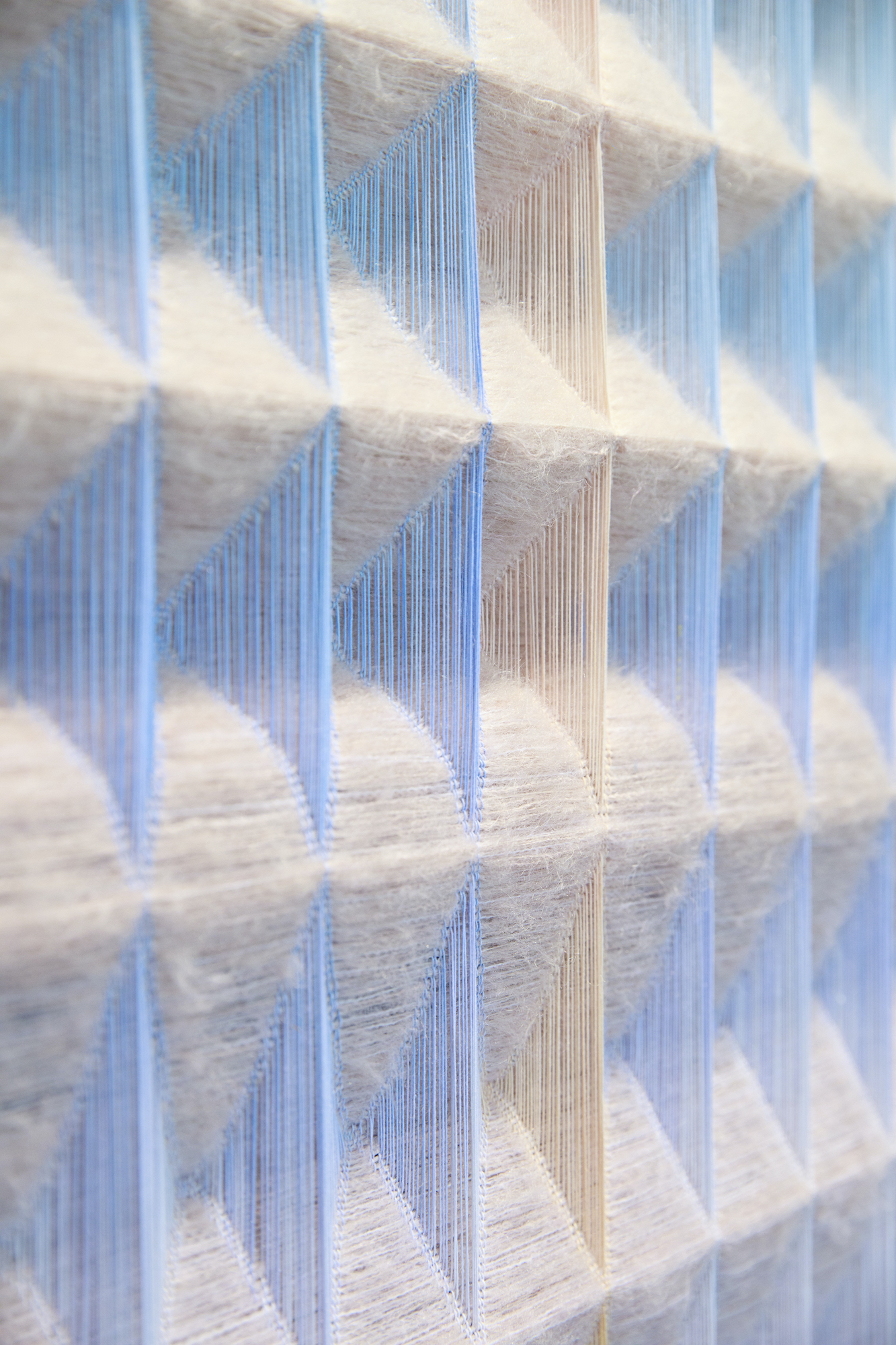 The museum’s alumni-spotlight gallery holds Anya Molyviatis’ exhibition, SUBMERGE. Hanging on the walls and the ceiling is a series of 7-foot-long weavings that feature bleeding colors. A meticulous weaver, who spent a month on the loom making each work, Molyviatis aims to awaken the senses and create novel relationships between colors inspired by nature. In a continuous loop of warp and weft, cotton runs vertically, and mohair wool runs horizontally, creating gradients and a 3-D element. Using a dobby loom—one of 20 in existence—that allows the warp threads to be raised and lowered, she creates small craters that lend resemblance to a honeycomb.