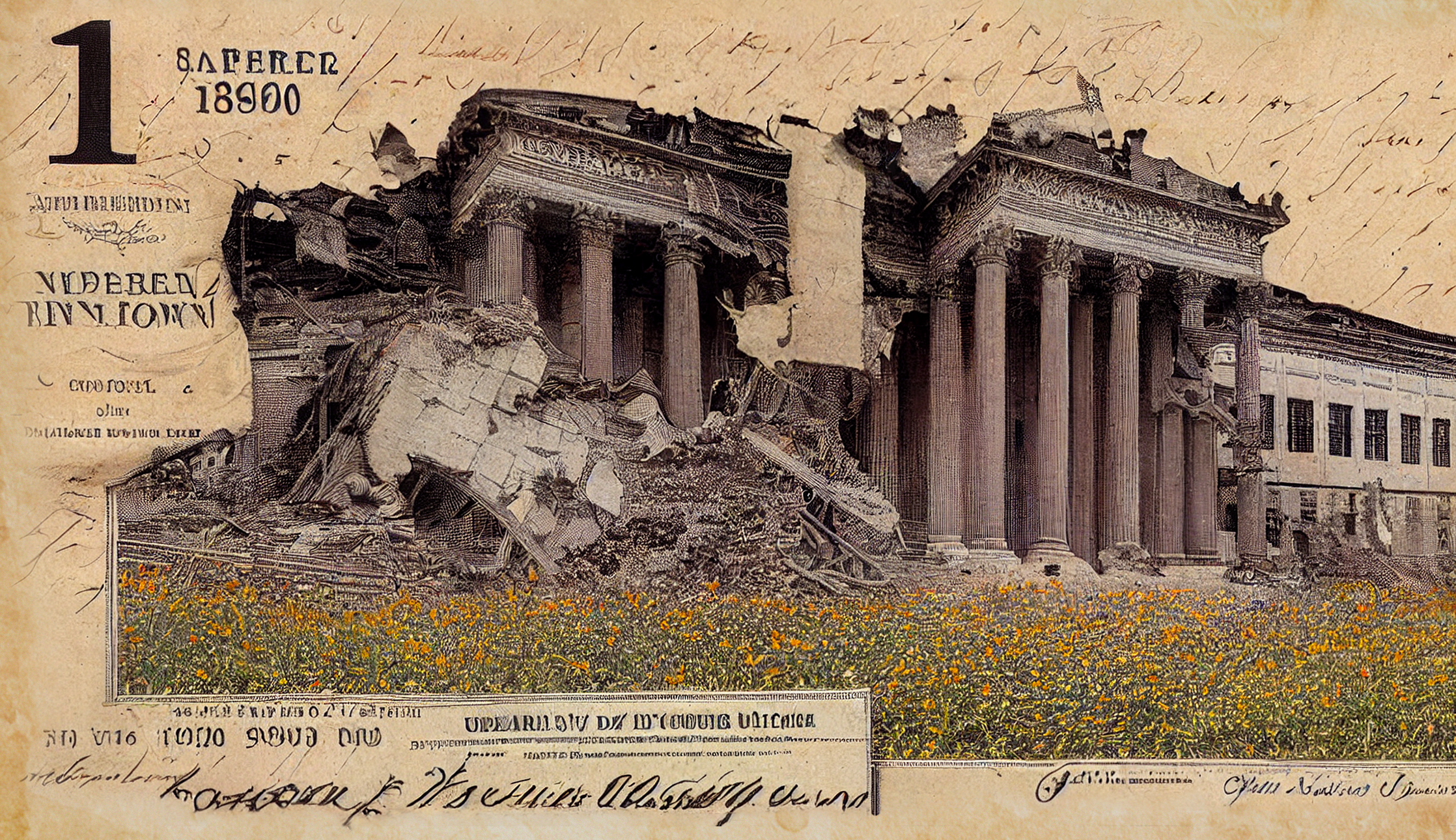 Most artists using image systems explain that the initial output is rarely sufficient. Artist Aaron Huey generated images of political activism that he then curated and produced into the semblance of fiat paper money for Currency of Protest (2022). Huey found the depictions of people produced by the text-to-image generators problematic and, unwilling to reiterate the prejudices of historic media content, he largely removed those images from the edition. The work mimics US currency, but it replaces the tightly controlled arrangement of monuments and white leaders with scenes of unrest—burning cars, demolished buildings, wire fencing, and barricades. These images are surrounded by the machine’s approximations of value signs and notations, which, when combined, designate each scrap of paper as a form of currency. The work surfaces connections between the economic order and revolutionary and militaristic movements. No despair, however, as one side of the bill shows wildflowers and grasses growing around this destruction. Finally, Huey printed the bills on seed paper, alluding to an activist phrase, “they tried to bury us; they didn’t know we were seeds.”